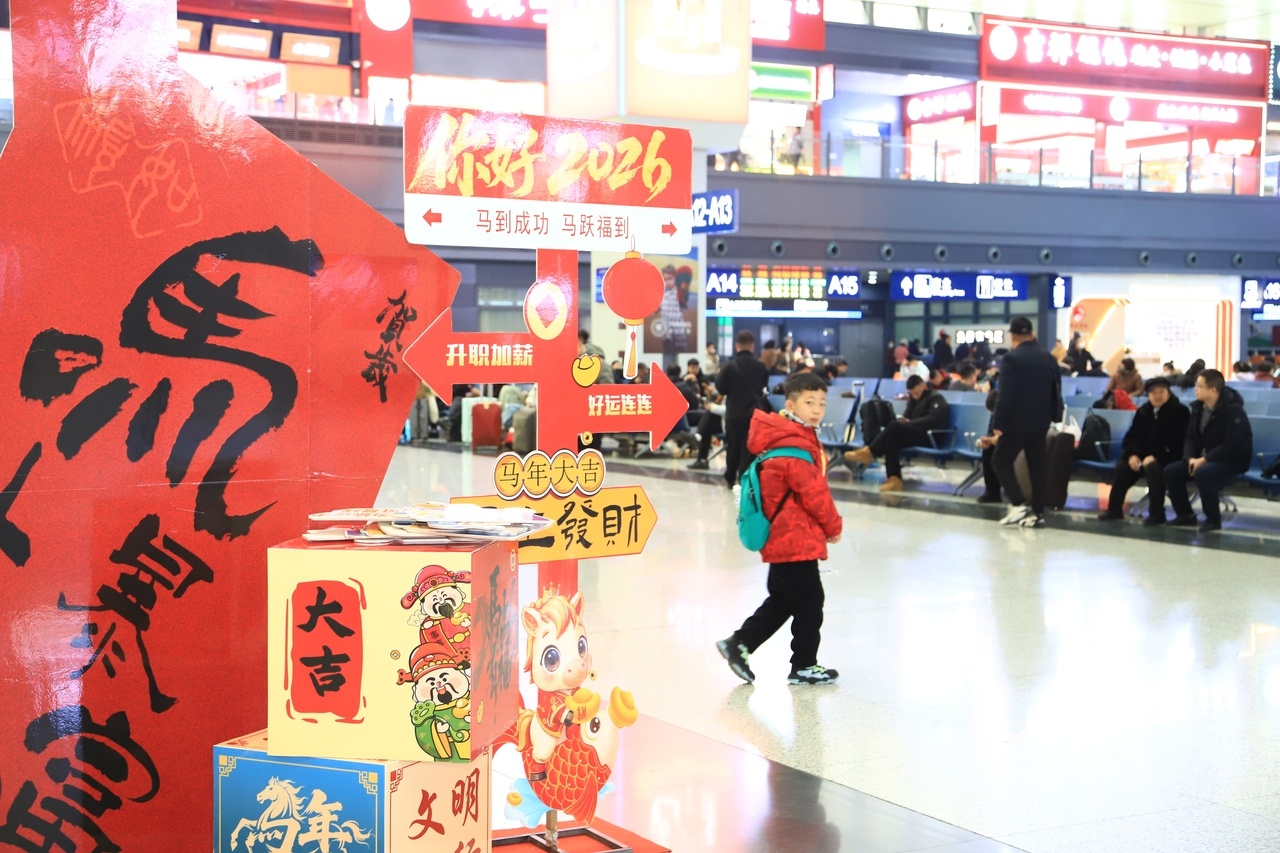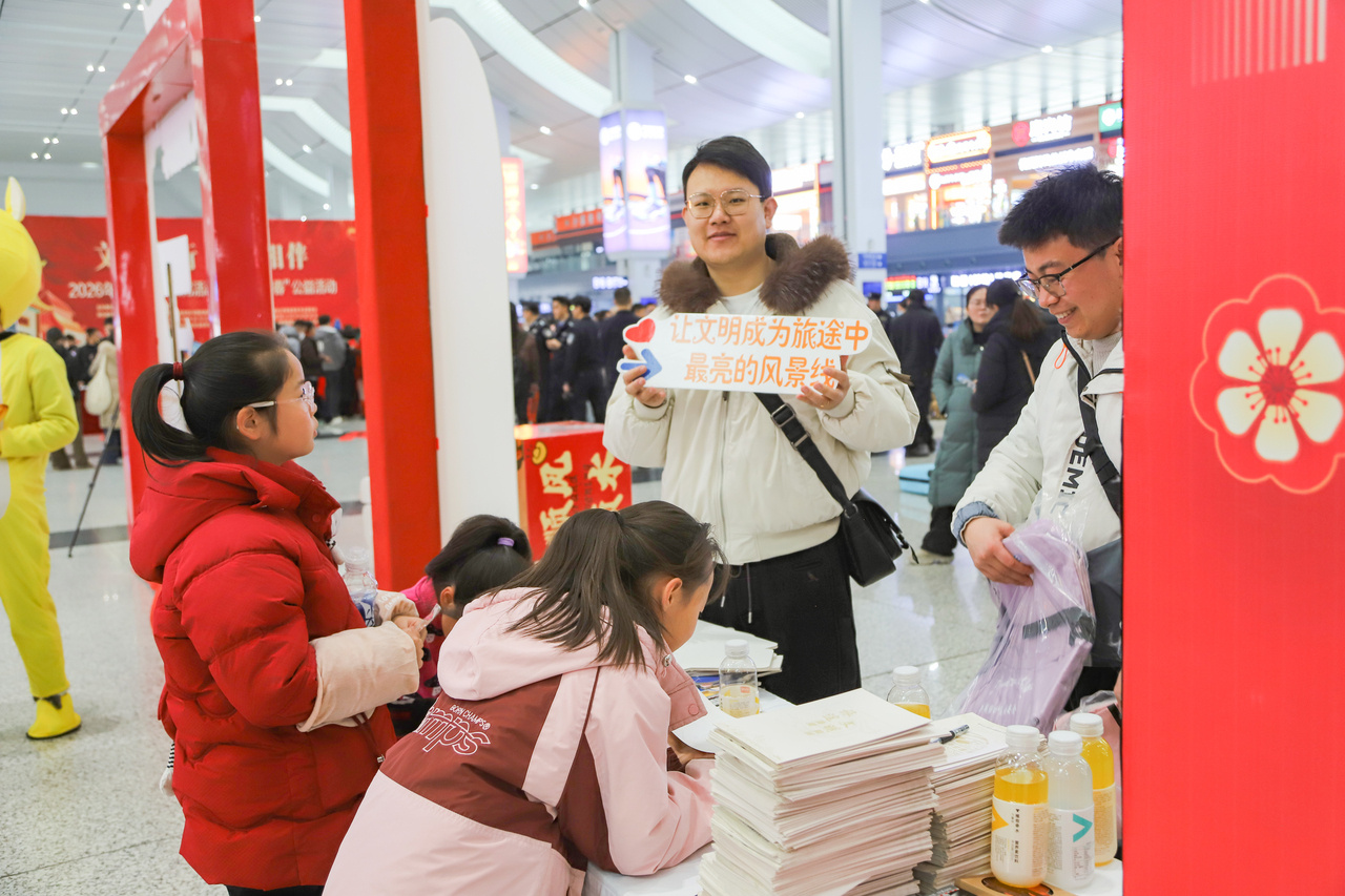 候车室内,舞蹈《舞动之礼》《青苹果乐园》活力绽放,歌曲《启程》《亲爱的旅人》温暖回家路;“山河入画·铁轨连诗”文创产品互动问答引发旅客踊跃参与,马年人偶志愿者引导大家在签名墙留言打卡,新年主题背景墙前旅客纷纷驻足绘制贺卡,写下对家人的思念与新春的期许。此外,“我的铁路风景”优秀作品展览区集中展示全路精品佳作,为春运增添了浓厚的文化氛围。